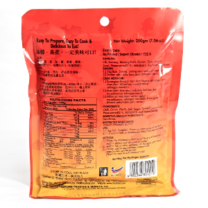 产地:马来西亚成份: 辣椒、葱、蒜、盐、糖、黄姜、香茅、保鲜剂 (E211)、味精 (E621)、和植物油 用料: 1. 1公斤鱼,苏东,虾或其它海鲜 2. 1粒椰浆或适量生奶 烹调法: 1. 将200g咖哩即煮料加入400ml清水,开火煮滚 2. 加入鱼或其他海鲜,搅拌均匀,慢火煮熟 3. 最后加入适量椰浆,煮滚后即可上桌。(煮浓不需加椰浆)